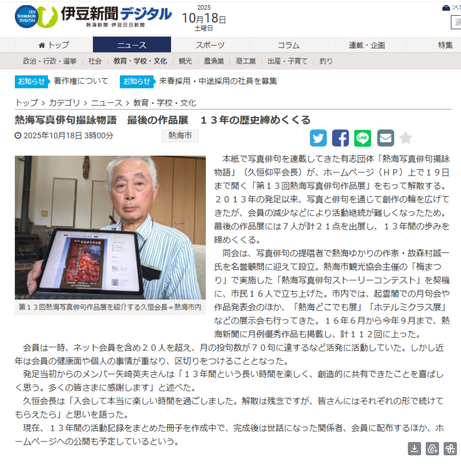 13年の間活動してきた「熱海写真俳句撮詠物語」は2025年10月18日をもって閉会致しました。