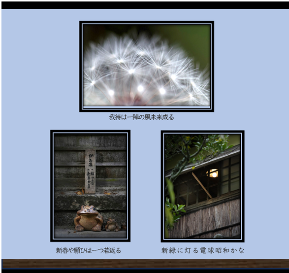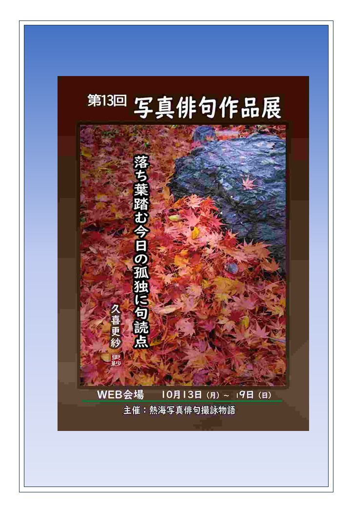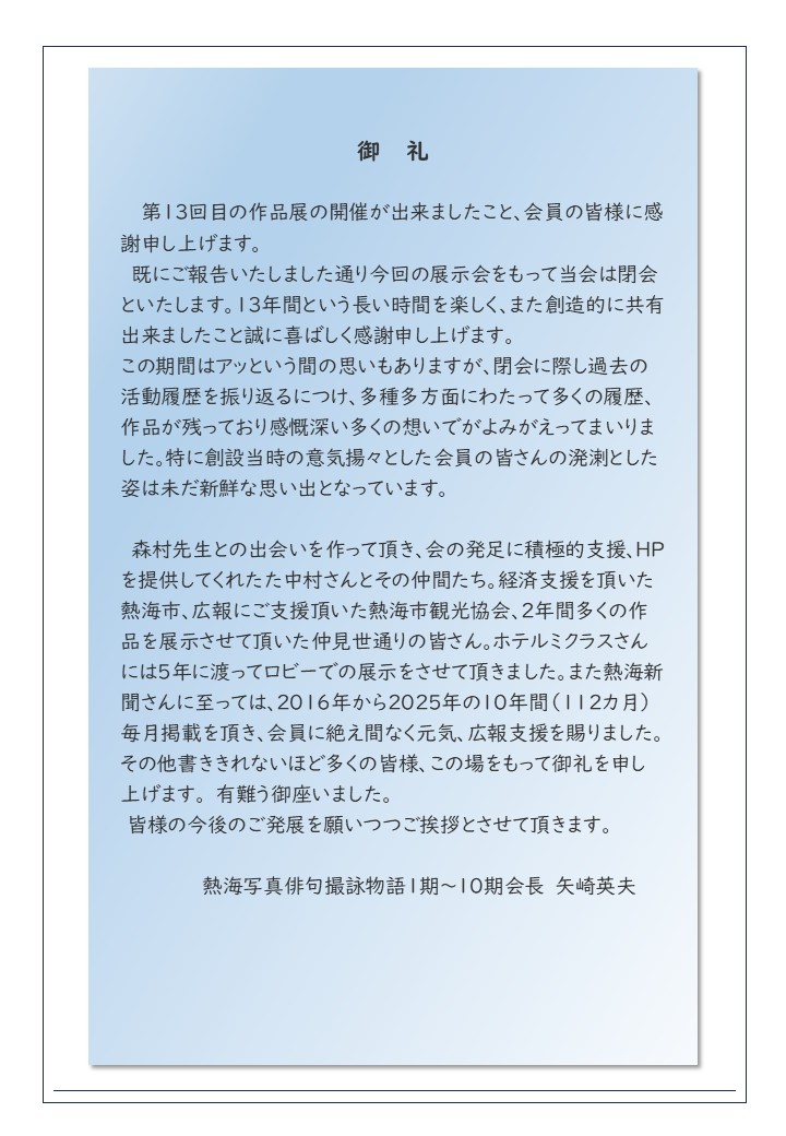 ご挨拶 第13回目の作品展を開催します 会員各位 展示会概要 熱海写真俳句撮詠物語会長 久恒仰平 |